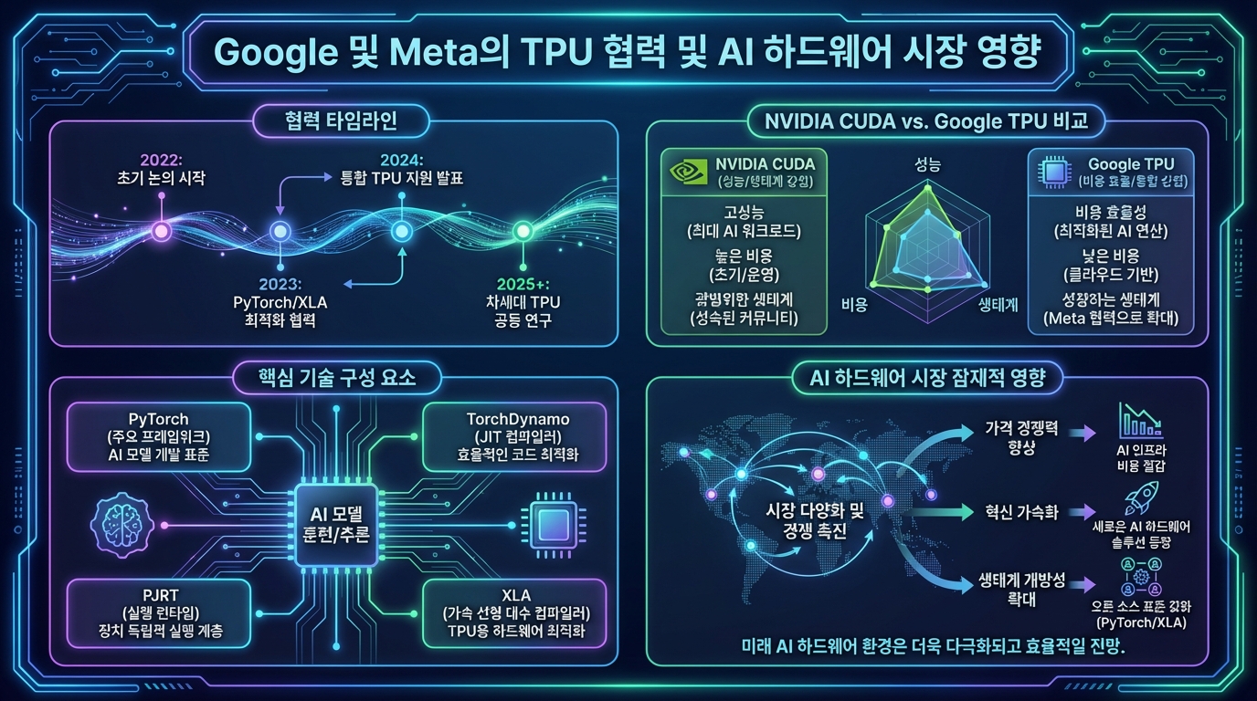 현재 엔비디아는 여전히 AI 칩 시장의 압도적인 선두 주자이며, 그 지배력이 단기간에 무너지지는 않을 것입니다. 그러나 구글과 메타의 ‘토치 TPU’ 프로젝트는 AI 인프라 시장에 중요한 변화의 가능성을 제시하고 있습니다. 1~2년 내에 파이토치 모델이 큰 코드 수정 없이 TPU에서 원활하게 구동될 수 있는 수준에 도달한다면, 더 많은 기업과 개발자들이 TPU를 AI 인프라의 강력한 대안으로 고려하게 될 것입니다.